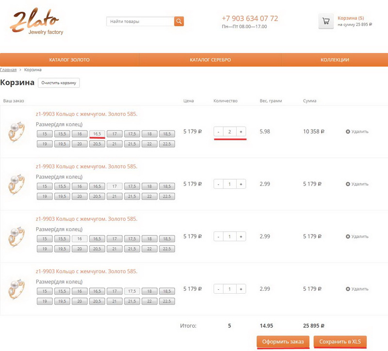 После того, как Вы закончите добавлять украшения в Ваш заказ, скорректировать и изменить количество в заказе можно уже в "Корзине" как на фото ниже.